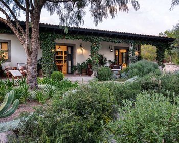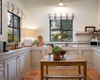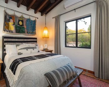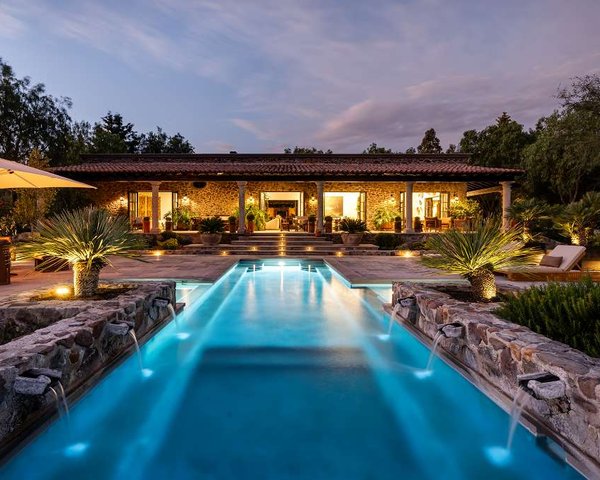 The main house is built around a serene interior courtyard with a charming fountain, perfectly capturing the essence of hacienda living. It offers two generously sized bedrooms, each complete with walk-in closets, en-suite bathrooms, and cozy fireplaces. The master suite also includes a library with a traditional boveda ceiling and its own fireplace, creating a peaceful retreat. The home’s gourmet kitchen is a chef’s dream, outfitted with premium appliances such as a Viking refrigerator and freezer, a Miele dishwasher, marble countertops, and a large island featuring a combination of marble and butcher-block finishes. Custom cabinetry, a wet bar with a wine fridge, and an adjacent grilling area enhance the kitchen’s functionality and make it perfect for entertaining.