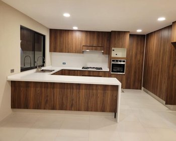 Custom walnut cabinetry in the kitchen, paired with white quartz countertops and breakfast bar.