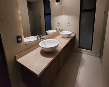 Modern guest bathroom with above-counter sink and ambient mirror lighting.