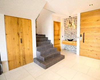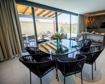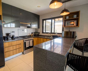 The modern and functional layout includes 5 generously sized bedrooms, each accompanied by its own full bathroom. For added convenience, one bedroom is located on the ground floor, perfect for guests or flexible living arrangements. The social areas feature a spacious living and dining room, ideal for hosting family gatherings or social events. The fully equipped kitchen, complete with top-tier appliances, is designed to satisfy even the most discerning culinary enthusiasts.