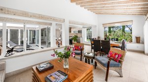 The primary suite, accessible from the main living area, is a serene retreat overlooking the garden and pool, complete with an en-suite bathroom and plenty of natural light.