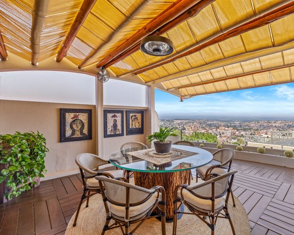 Every detail has been meticulously crafted, from the stunning bóveda ceilings and intricately hand-carved doors to the inviting breakfast nook in the kitchen, which perfectly frames the views of Centro. Designed with an open floor plan, the home maximizes its spectacular vistas to the south, west, and north, while seamlessly blending indoor and outdoor living. Highlights include a state-of-the-art bar, two dining areas, and motorized sun-blocking shades for effortless comfort.