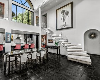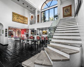 At the heart of the home lies an impressive open-concept living and dining area. Soaring ceilings, a breathtaking bóveda vault, and an abundance of natural light create a dramatic yet welcoming space. The centerpiece is a striking fireplace adorned with custom glasswork by renowned artist Ana Thiel, adding an artistic flair to the room. The gourmet kitchen is both functional and stylish, offering ample prep space, storage, and modern amenities, making it perfect for everything from intimate dinners to lively celebrations. This is where the true spirit of "encuentro" (gathering) comes alive, inspiring the name Casa Encuentro—a place designed for connection and togetherness.