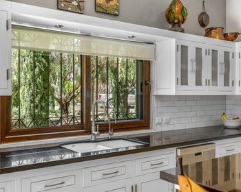 • A modern, fully-equipped kitchen featuring reverse osmosis water filtration, a garbage disposal, and durable PVC doors and windows.
