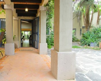 The private wing of the home is accessed via a softly lit, arched hallway, ideal for displaying artwork. The primary suite is a retreat of its own, boasting a study, high ceilings, French doors that open to the garden, and an en-suite bathroom with a spacious tiled shower. The other two bedrooms, with their vaulted ceilings and intricate wood detailing, share a bathroom featuring a skylit tub for a bright and airy feel.