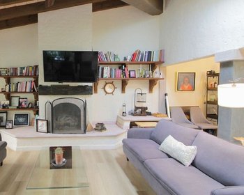 The living room, featuring exposed beams and a fireplace, offers a warm and inviting space that seamlessly connects to the outdoors through glass doors. Adjacent to this is the dining room, adorned with a stunning dome ceiling, which opens to both the central courtyard and the backyard, ensuring a harmonious indoor-outdoor flow.
