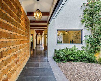 • Glass sliding doors lead to a serene central patio with volcanic stone, quarry floors, stone wall, a fountain and table to eat outdoo From the room, arched glass doors open to a gravel backyard, surrounded by natural vegetation on the ground and walls.