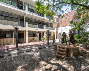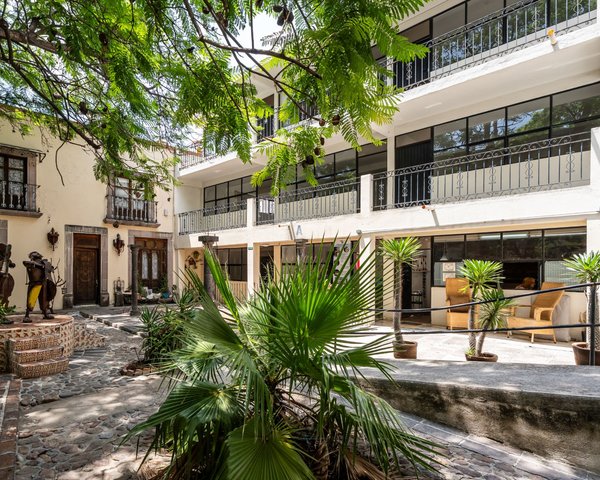 Located in one of the most vibrant and sought-after areas of San Miguel de Allende’s historic center, this exceptional property offers elegance, functionality, and remarkable commercial potential. Situated on the iconic Calzada de la Aurora, this estate features multiple spaces ideal for mixed-use, making it perfect for developers, entrepreneurs, or educational institutions. The main entrance leads to two independent commercial spaces: one on the ground floor currently operating as a beauty salon, and another on the upper level that hosted a well-known gym for many years. At the heart of the property is a large central courtyard, graced with beautiful jacaranda trees, providing natural light, shade, and a serene environment—perfect for events or open-air lounges. Surrounding the courtyard is a building with nine commercial spaces or classrooms, three of which have full bathrooms. These units have a long history of being used by various universities, making the property ideal for educational, cultural, or office purposes. At the rear of the property, you'll find a comfortable two-story home with three bedrooms and three full bathrooms, perfect as a private residence, guesthouse, or vacation rental. A defining feature of the property is its elegant black stone façade—the only one of its kind in San Miguel’s historic center—lending it a strong architectural identity and curb appeal.