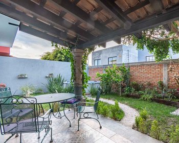 Welcome to Casa Celeste, a warm family home located in the charming community of El Suspiro along Paseo Real. This beautiful residence combines Mexican colonial touches with elegant finishes such as wooden ceilings and a soaring double-height bóveda ceiling, framed by an expansive picture window that captures the view of a majestic tree. The layout is both comfortable and versatile: A spacious kitchen and living areas open to a generous yard. On the main level, you’ll find a bedroom with a mini-kitchenette and ensuite bathroom, ideal for guests or independent living. Upstairs, there are two additional bedrooms, including the principal suite with a walk-in closet and ensuite bathroom. A flexible studio/TV room/yoga space with a striking round window completes this level. The rooftop terrace crowns the home, offering sweeping views of the mountains, city, and the iconic Parroquia.