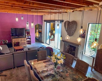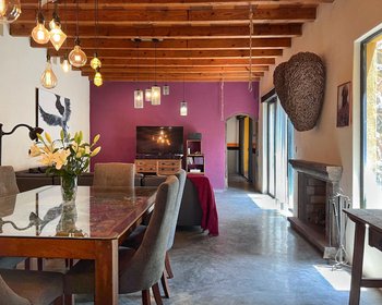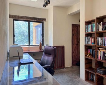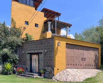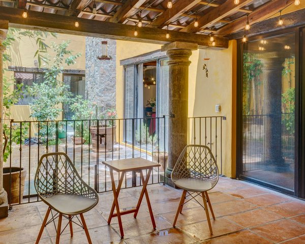 Tucked away on a quiet cul-de-sac in La Cañada, a small subdivision in the upper part of Los Frailes, Casa Liz blends contemporary architecture with traditional details and a touch of bohemian charm. Spread across three levels, the home offers a thoughtful layout, abundant natural light, and unobstructed views of the surrounding landscape. On the first level, a two-car garage/carport welcomes you before entering through restored antique wooden doors that set the tone for the character found throughout the home. To the right, a kitchen with adjoining laundry/pantry, and to the left, a guest half-bathroom featuring a sink carved from reclaimed wooden beams and a copper faucet shaped like a traditional water jar. Beyond, the open living and dining area boasts nearly double-height ceilings and polished concrete floors that run throughout the house. South-facing sliding glass doors open to a central courtyard, filling the space with air and light. Extending from here, a TV/media room opens directly to a covered outdoor grill area—an inviting setting that flows seamlessly for indoor-outdoor entertaining. The second floor hosts the main bedroom with en-suite bath, walk-in closet, and a private west-facing balcony offering serene views of the water reservoir and the adjacent creek, federally protected land that ensures lasting privacy and greenery. An office nook leads to a spacious hallway connecting two guest bedrooms that share a full bathroom, one of which features an elegant boveda ceiling. On the third level, a covered terrace captures sweeping views of Presa Allende, the mountains, and spectacular sunsets—a perfect retreat at the end of the day. With its quiet setting, character-rich finishes like antique doors and vaulted ceilings, generous natural light, and surrounding green spaces that will remain protected, Casa Liz is a unique opportunity to enjoy San Miguel living with style and comfort.